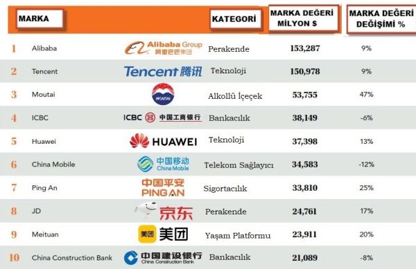 Alibaba yüzde 9 büyümeyle ulaştığı 153 milyar dolarlık değerle, 2020 yılında Çin’in en değerli markası olmaya devam etti. Onu yüzde 9’luk artışla 151 milyar dolarlık değere ulaşan Tencent ikinci, yüzde 47’lik artışla 54 milyar dolarlık değere ulaşan alkollü içecek markası Moutai da üçüncü sırada izliyor.