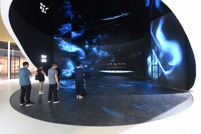 Çin’in güneyindeki Guangdong eyaletinde bulunan Shenzhen’de düzenlenen 19. Çin (Shenzhen) Uluslararası Kültürel Endüstriler Fuarı’nda, Dijital Çin sergi alanını gezen bir ziyaretçi, 8 Haziran 2023. (Fotoğraf: Liang Xu/Xinhua)