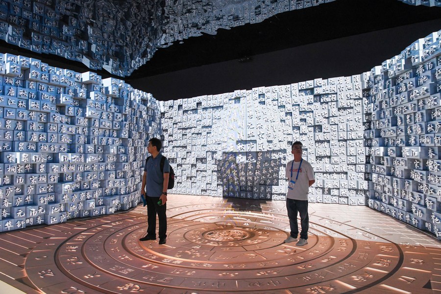 Çin’in güneyindeki Guangdong eyaletinde bulunan Shenzhen’de düzenlenen 19. Çin (Shenzhen) Uluslararası Kültürel Endüstriler Fuarı’nda taşınabilir tipte baskının 3 boyutlu gösterimini izleyen insanlar, 8 Haziran 2023. (Fotoğraf: Liang Xu/Xinhua)
