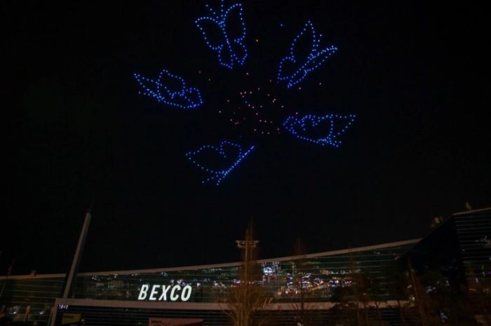 Güney Kore’nin Busan kentinde düzenlenen 2023 Güney Kore İnsansız Hava Aracı Fuarı’nın bir parçası olarak Perşembe gecesi Busan Fuar ve Kongre Merkezi’nin (BEXCO) üzerinde 500 insansız hava aracıyla (İHA) ışık gösterisi düzenlendi.