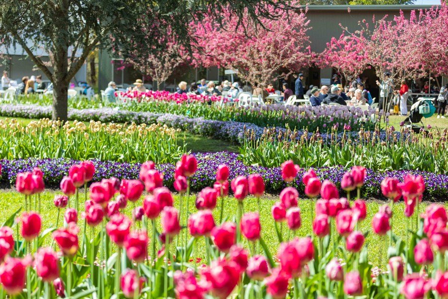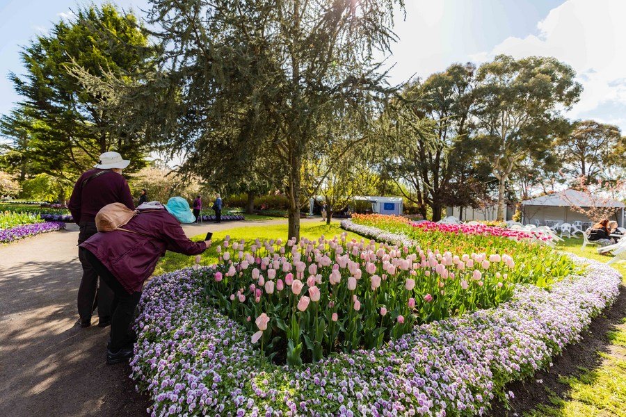 Avustralya’nın başkenti Kanberra’nın banliyösündeki bir bahçede çiçek açan laleler ve ziyaretçiler görülüyor, 15 Ekim 2022. (Fotoğraf: Chu Chen/Xinhua)