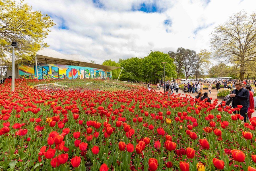 Avustralya’nın başkenti Kanberra’da yer alan Commonwealth Parkı’ndaki Floriade çiçek festivaline katılan insanlar. , 16 Ekim 2022. (Fotoğraf: Chu Chen/Xinhua)