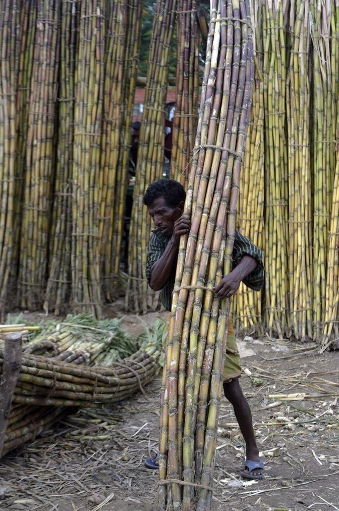 Bangladeş’in başkenti Dakka’da bir pazarda şeker kamışı saplarını hazırlayan bir işçi, 29 Ağustos 2022. (Fotoğraf: Xinhua)