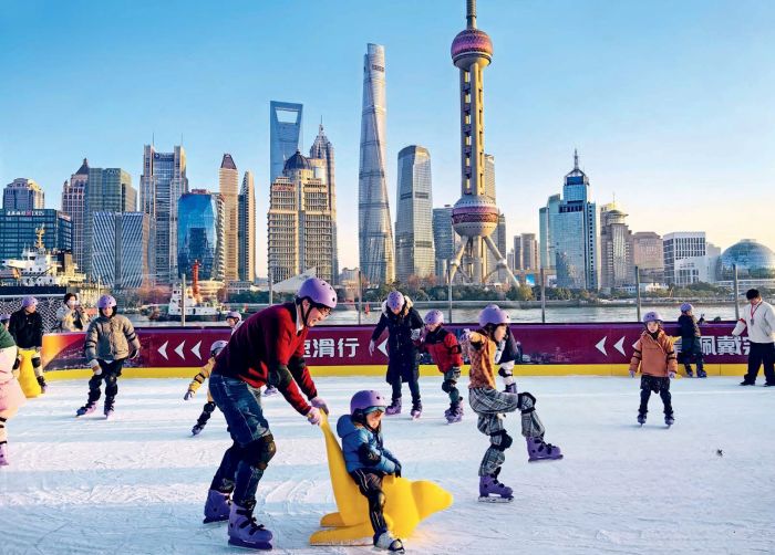 Çin’in kış sporları patlaması iş yaratıp, ekonomik büyümeyi teşvik ediyor. Bu da genel halka, yerel yönetimlere ve işletmelere önemli faydalar sağlıyor. Yukarıdaki görselde, Şanghay’daki Kuzey Bund’da bir gemi güvertesinden dönüştürülen buz pateni pistinde eğlenen insanlar görülüyor.
