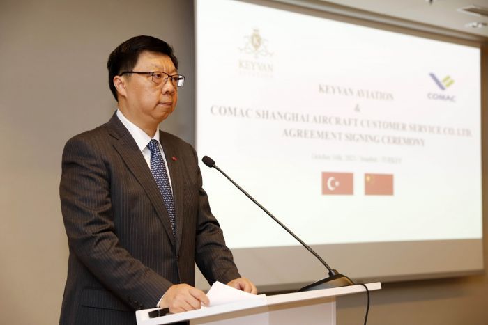 İmza törenine; Keyvan Havacılık CEO’su ve Kurucusu Mehmet Keyvan ve COMAC CEO’su Li Ling’in yanı sıra Çin Halk Cumhuriyeti İstanbul Başkonsolosu Wei Xiaodong ve Çin Dış Ekonomik İlişkiler Konseyi Türkiye Kurulu Koordinatörü Tuncer Köklü katıldı. Saha İstanbul Genel Sekreteri Levent Kerim Uça, Genç Yatırımcı İş Adamları Derneği (GYİAD) Başkanı Mustafa Özer törene katılım sağlayan diğer isimler arasında yer aldı.