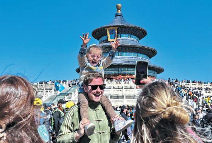 Vizesiz seyahat politikaları, yurtdışı gezginlerine daha kapsamlı deneyimler yaşama olanağı sunuyor. Turistler, Beijing’deki Cennet Tapınağı Parkı’nda bulunan Bereketli Hasat İçin Dua Salonu önünde fotoğraf çekiyorlar. (Wang Xin/ China Daily)