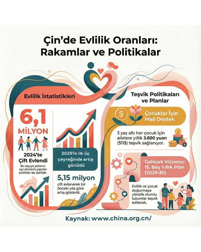 2025’in ilk üç çeyreğinde ise sayılarda mütevazı bir artış görüldü. Geçen yılın aynı dönemindeki 4,75 milyon çifte kıyasla yaklaşık 5,15 milyon çift evliliklerini kaydettirdi. Öte yandan Temmuz ayında, 3 yaşın altındaki her çocuk için ailelere yılda 3.600 yuan (511 dolar) tutarında mali destek sağlanmasını öngören bir politika uygulamaya konuldu.