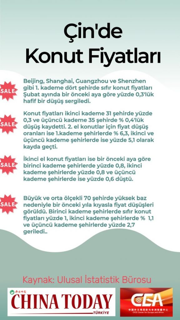 Çin’in büyük kentlerinde konut fiyatlarındaki düşüşte Şubat ayında bir önceki aya göre daralma kaydedildi. Ulusal İstatistik Bürosu tarafından Cuma günü yapılan yazılı açıklamaya göre Beijing, Shanghai, Guangzhou ve Shenzhen olmak üzere birinci kademe dört şehirde sıfır konut fiyatları Şubat ayında bir önceki aya göre yüzde 0,3’lük hafif bir düşüş sergiledi. Öte yandan, konut fiyatları ikinci kademe 31 şehirde yüzde 0,3 ve üçüncü kademe 35 şehirde yüzde 0,4 düşüş sergiledi.