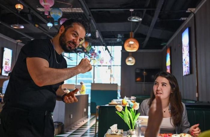 Çin’in güneybatısındaki Chongqing kentinde açtığı Türk restoranında müşterileriyle sohbet eden Oğuzhan Kaya, 9 Nisan 2026. (Fotoğraf: Chen Cheng/Xinhua)