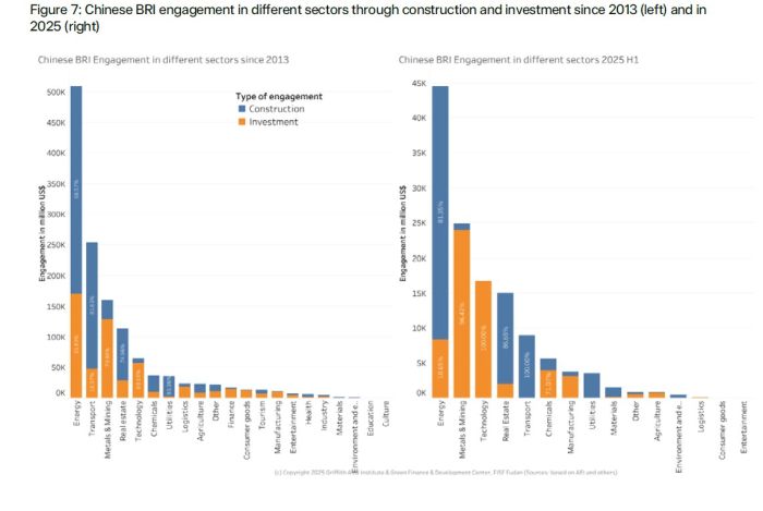 Çin, çeşitli kömür madeni altyapısı inşaatları yoluyla kömürle ilgili faaliyetlere yatırım yapmaya devam etti. Metaller ve madencilik sektörü, 2025 yılının ilk 6 ayında yaklaşık 24,9 milyar ABD dolarıyla (madencilikte yaklaşık 10 milyar ABD doları) 2024 yılının tamamını (kendisi de rekor bir yıldı) aşarak yeni rekorlara ulaştı. Teknoloji ve üretim de rekor kırarak güneş enerjisi, elektrikli araç bataryaları ve hidrojen (Nijerya’da) alanlarındaki yüksek teknoloji girişimleriyle yaklaşık 23,2 milyar ABD dolarına ulaştı.