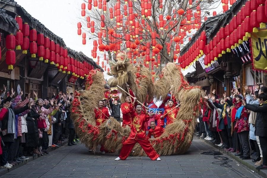 Çin’in güneybatısındaki Sichuan eyaletinde bulunan antik kasaba Langzhong’da kuru otlardan yapılmış bir ejderhayla yöresel ejderha dansını icra eden insanlar, 8 Ocak 2022. (Fotoğraf: Wang Yugui/Xinhua)Havadan çekilen fotoğrafta, Çin’in güneybatısındaki Sichuan eyaletinde bulunan antik kasaba Langzhong’da ipek yelpaze dansı yapan insanlar görülüyor, 8 Ocak 2022. (Fotoğraf: Wang Yugui/Xinhua)