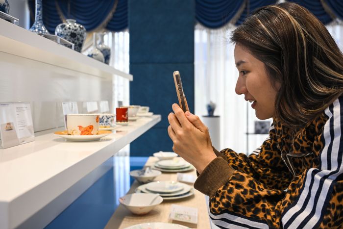 İstanbul’da Jingdezhen porselenlerinin satıldığı resmi mağazada sergilenen ürünlerin fotoğrafını çeken bir kişi, 31 Mayıs 2025. (Fotoğraf: Liu Lei/Xinhua)