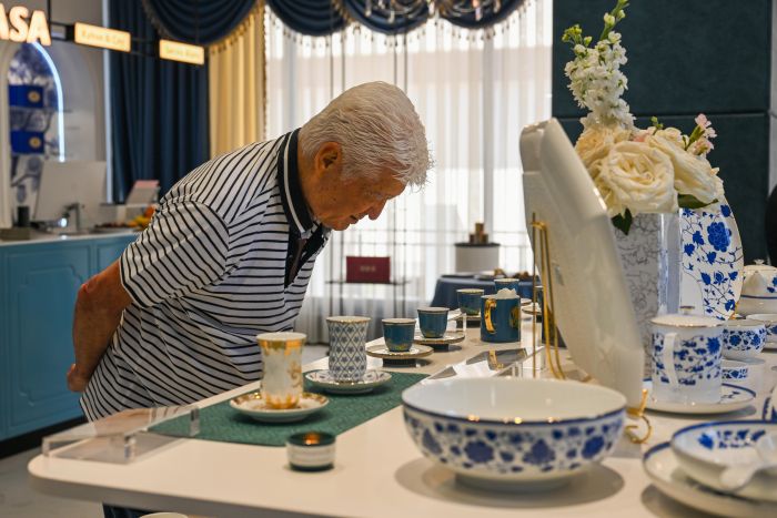 İstanbul’da Jingdezhen porselenlerinin satıldığı resmi mağazada sergilenen ürünleri inceleyen bir kişi, 31 Mayıs 2025. (Fotoğraf: Liu Lei/Xinhua)