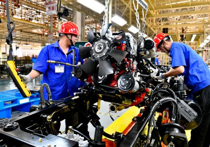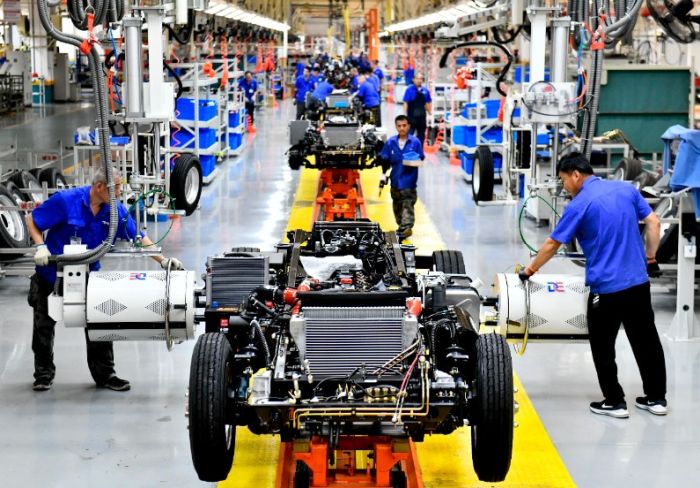 Çin’in doğusundaki Shandong eyaletinin Weihai şehrinin Wendeng bölgesindeki Weichai Yeni Enerji Ticari Araç A.Ş.’nin üretim hattında işçiler bir otomobili birleştiriyor, 21 Temmuz 2023. (Fotoğraf: Guo Xulei/Xinhua)