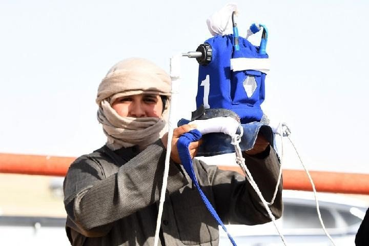 Kuveyt’in Ahmedi vilayetinde, yarışmadaki bir devenin arkasına sabitlenmek üzere robot jokeyi tutan bir kişi, 5 Şubat 2022. (Fotoğraf: Ghazy Qaffaf/Xinhua)