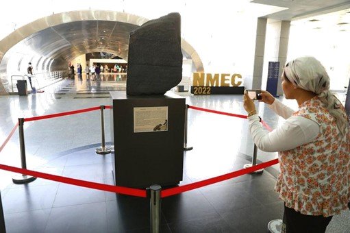 Mısır’ın başkenti Kahire’de Ulusal Mısır Medeniyeti Müzesi’nde bulunan Rosatta Ta şı’nın replikasının fotoğrafını çeken bir ziyaretçi görülüyor, 20 Eylül 2022. Ulusal Mı sır Medeniyeti Müzesi’nin giriş holüne yerleştirilen Rosatta Taşı replikası, altındaki a çıklamaları okurken hayranlıklarını gizleyemeyen hem Mısırlıları hem yabancıları kendine çekiyor.
