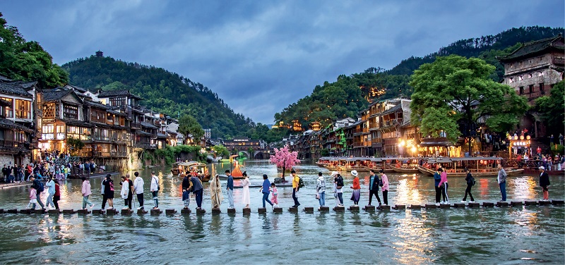 MENG JIAXIN /CHINA TODAY –Yunnan-Guizhou Platosu’nun doğusunda, kanatlarını açmış ve uçuşa hazır bir anka kuşuna benzeyen Fenghuang (Çince’de “anka kuşu” anlamına gelir) adında 1000 yıllık bir kasaba yer alıyor. Günümüzde ulusal 5A turistik cazibe merkezi olarak derecelendirilen Fenghuang, Çin’in en çok ziyaret edilen antik kentlerinden biridir. Ziyaretçiler, Ming ve Qing hanedanlarına dayanan 120’den fazla iyi korunmuş geleneksel konutu görmek için akın ediyor ve iki alan devlet koruması altında. Ziyaret listesinde en üst sıralarda Kuzey Kapısı Rıhtımı, Hong Köprüsü, Doğu Kapısı Kulesi, Fenghuang Antik Kent Müzesi, Shen Congwen’in eski ikametgahı, Chongde Salonu, Wanshou Sarayı ve Yang Ailesi Atalar Salonu yer alıyor.