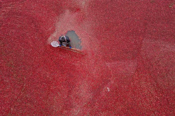 FUYUAN, 8 Kasım (Xinhua) — Havadan drone ile çekilen fotoğrafta, Çin’in kuzeydoğusundaki Heilongjiang eyaletinin Fuyuan kentinde bulunan bir kızılcık yetiştirme tesisinde kızılcık hasadı yapan bir işçi, 6 Kasım 2025. (Fotoğraf: Zhang Tao/Xinhua)