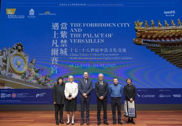 Hong Kong’un eski genel müdürü Carrie Lam tarafından kendisine gönderilen bir gazete kupürünü sallıyor. Küpürde, HKPM’nin yeni özel sergisi olan Yasak Şehir ve Versay Sarayı: On Yedinci ve On Sekizinci Yüzyıllarda Çin-Fransa Kültürel Karşılaşmaları hakkında bir yazı var. Köşe yazarı makalesinde, Hong Kong’un bu tür yüksek kaliteli kültürel ürünlere sahip olması gerektiğini söyleyerek övgüler yapıyor.