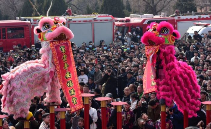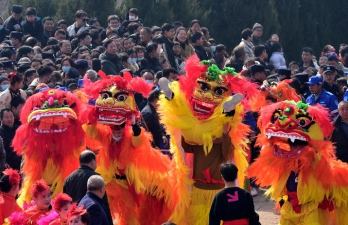 Çin’in orta kesimindeki Henan eyaletine bağlı Xunxian ilçesinde düzenlenen bir tapınak festivalinde aslan dansı yapan halk sanatçıları, 25 Şubat 2024. (Fotoğraf: Zhu Xiang/Xinhua)