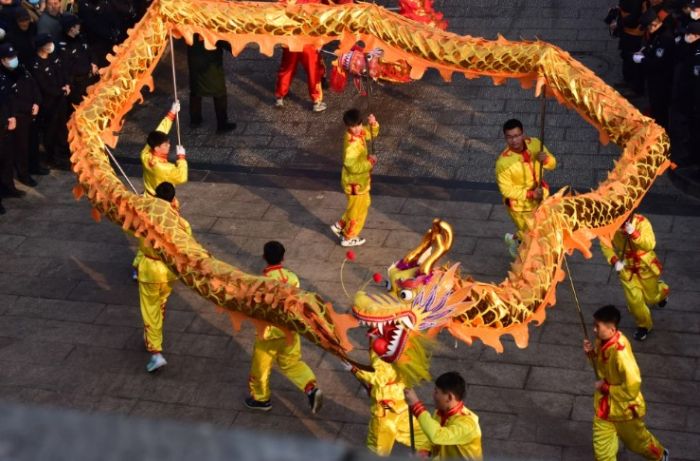 Çin’in orta kesimindeki Henan eyaletine bağlı Xunxian ilçesinde düzenlenen bir tapınak festivalinde ejderha dansı yapan halk sanatçıları, 25 Şubat 2024. (Fotoğraf: Zhu Xiang/Xinhua)