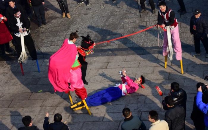 Çin’in orta kesimindeki Henan eyaletine bağlı Xunxian ilçesinde düzenlenen bir tapınak festivalinde komedi gösterisi yapan halk sanatçıları, 25 Şubat 2024. (Fotoğraf: Zhu Xiang/Xinhua)
