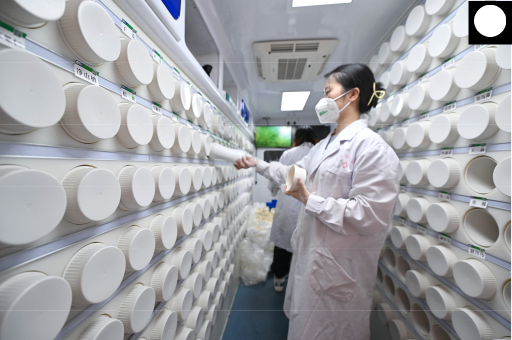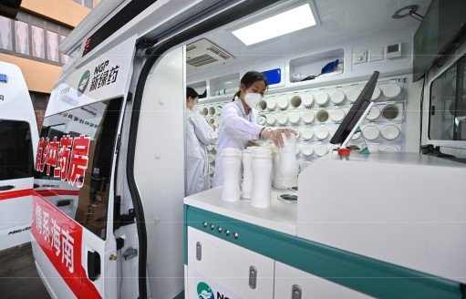 Çin’in güneyindeki Hainan eyaletinin Sanya kentinde bir eczacı, “gezici geleneksel Çin tıbbı eczanesinde”, geleneksel Çin tıbbı dozları hazırlamak için, içinde konsantre bitkisel granüller bulunan bir şişeyi alıyor. (Fotoğraf: Guo Cheng/Xinhua)