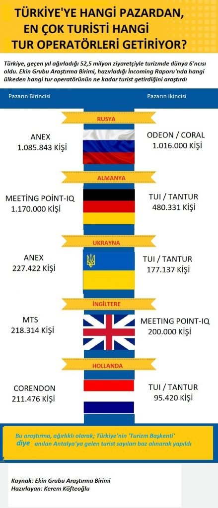 Ekin Grubu Araştırma Birimi, 2019 yılında Türkiye’ye hangi pazardan hangi tur operatörünün ne kadar turist getirdiğini içeren İncoming Raporu’nu açıkladı. Türkiye’nin ‘Turizm Başkenti’ olarak anılan Antalya’nın baz alınarak hazırlanan İncoming Raporu’nu sizler için özetledik.