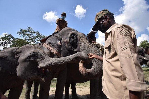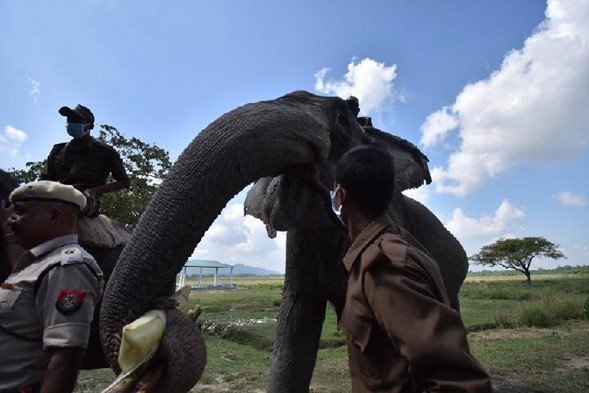 Hindistan’ın kuzeydoğusundaki Assam eyaletinin Golaghat bölgesinde bulunan Kaziranga Milli Parkı’nda bir orman görevlisi fillere yiyecek veriyor. (Fotoğraf: Str/Xinhua)