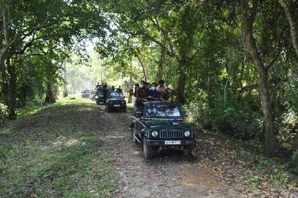 Hindistan’ın kuzeydoğusundaki Assam eyaletinin Golaghat bölgesinde bulunan Kaziranga Milli Parkı’nda safari yapan turistler görülüyor. (Fotoğraf: Str/Xinhua)
