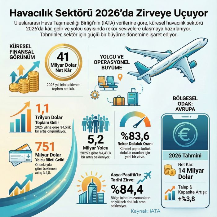 Uluslararası Hava Taşımacılığı Birliği’ne (IATA) göre, küresel havayolu endüstrisinin 2026 yılında toplam net karının 41 milyar dolara ulaşması bekleniyor. Sektör gelirlerinin 2026 yılında yaklaşık 1,1 trilyon dolara ulaşacağını ve 2025 yılındaki beklenen gelire göre yüzde 4,5’lik bir artış göstereceğini öngörüyor.