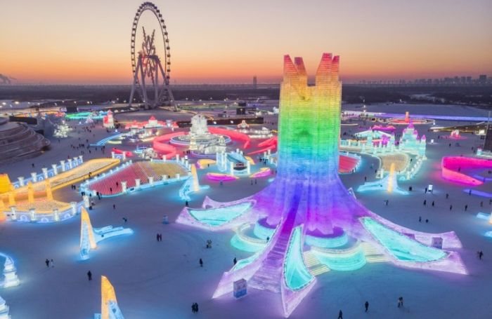 Havadan çekilen fotoğrafta Çin’in kuzeydoğusunda yer alan Heilongjiang eyaletinin merkezi Harbin’de bulunan Harbin Buz-Kar Dünyası Tema Parkı’nı ziyaret eden turistler görülüyor, 3 Ocak 2023. (Fotoğraf: Xie Jianfei/Xinhua)
