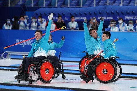 Çin’in başkenti Beijing’deki Ulusal Su Sporları Merkezi’nde gerçekleştirilen Beijing 2022 Paralimpik Kış Oyunları’nda Çin ve İsveç arasındaki Tekerlekli Sandalye Curling Altın Madalya Maçı’nın ardından Çinli oyuncular zaferi kutluyorlar