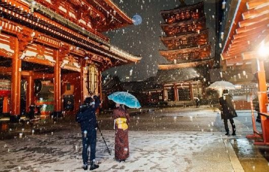 Japonya’nın başkenti Tokyo’da Perşembe günü yağan kar, Asakusa’daki antik Sensoji Tapınağı’na ayrı bir güzellik getirirken insanlar manzaranın keyfini çıkardı ve fotoğraf çekti.