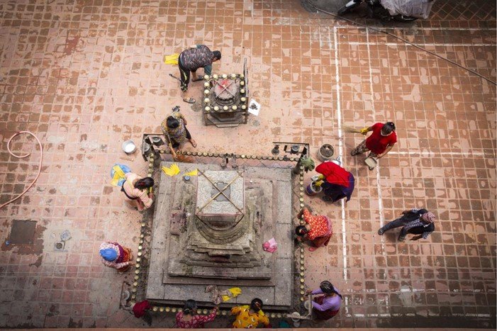 Nepal’in Lalitpur kentinde düzenlenen Sithi Nakha Festivali vesilesiyle avlu ve stupayı temizleyen insanlar görülüyor, 5 Haziran 2022. (Fotoğraf: Hari Maharjan/Xinhua)