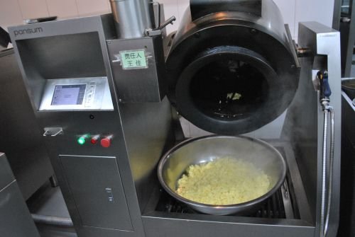 Her makinayı bir operatör kontrol ediyor. “Balık çeşnili dilimlenmiş domuz eti” düğmesine bastığınızda robotun koca göbeği dönmeye başlıyor. Operatör, robotun talimatları doğrultusunda yemeğe sos, marul, havuç ve diğer baharatlarını ekliyor; sonrasında dönen tambur bu malzemeyi otomatik olarak kızartıyor.