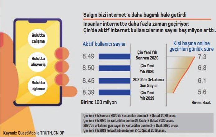 Salgın bizi Internet’e daha bağımlı hale getirdi. İnsanlar Internet’te daha fazla zaman geçiriyor. Çin’de aktif Internet kullanıcılarının sayısı beş milyon arttı.