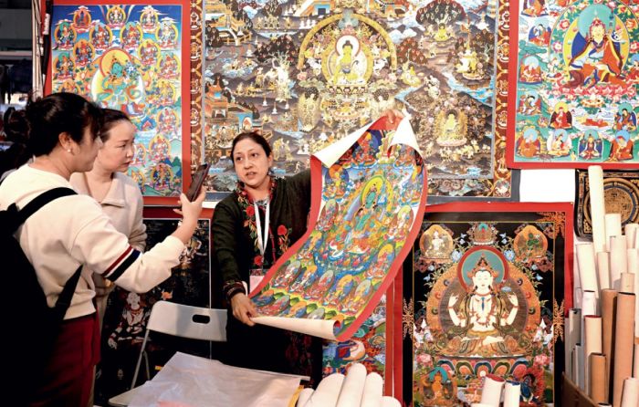 Tibet sanatının bir biçimi olan Thangka, geçmişi ve bugünü birleştirerek dünya çapındaki kültürleri birbirine bağlıyor. Yukarıda 30’u aşkın Tibetli ressamın iş birliğinin son ürünü olan, uzunluğu 200 metre, genişliği 1,8 metre olan eski Tubo krallarını tasvir eden bir Thangka resmi görülüyor.