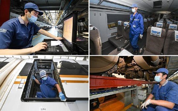 Shanghai’daki Hongqiao yüksek hızlı tren garı, Çin’in doğusundaki en büyük hızlı tren bakım merkezi.Buradaki çalışanlar, yüksek hızlı demiryolu sisteminin istikrarlı bir şekilde çalışmasını sağlamak için Nisan ayındaki Kovid-19 salgınından bu yana işlerini sürdürdüler.