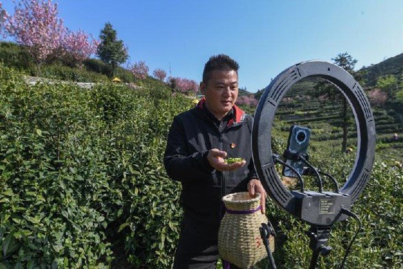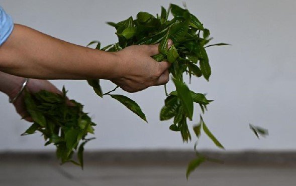 Çin’in güneybatısındaki Guizhou Eyaleti’nde yer alan Guiding İlçesindeki Yunwu Kasabasına bağlı Niaowang Köyünde bir köylü, yeni toplanmış çay yapraklarını gösteriyor, 29 Mart 2022. (Fotoğraf: Yang Wenbin/Xinhua)